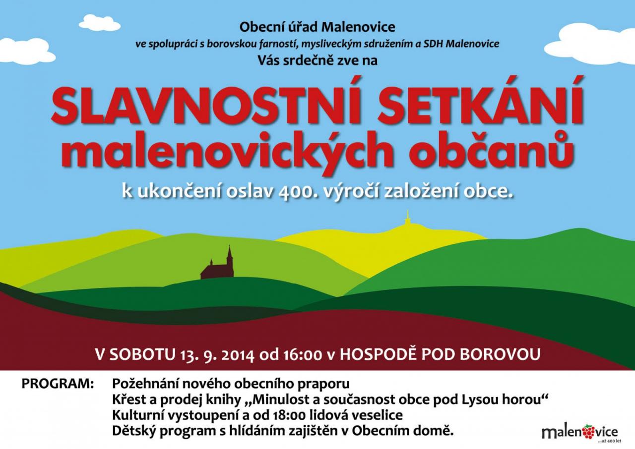 13. 9. 2014 se v Hospodě Pod Borovou konalo Slavnostní setkání malenovických občanů k ukončení oslav 400. výročí založení obce. Proběhl křest knihy: Malenovice - Minulost a současnost obce pod Lysou horou a posvěcení nového praporu obce Malenovice.